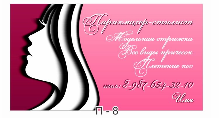 Шаблоны и образцы визитки парикмахераВизитка парикмахера — это прекрасная возможность заявить о себе, прорекламировать свои услуги и приобрести новых и постоянных клиентов. Это сравнительно недорогой способ повысить эффективность своей работы и перейти на принципиальной новый уровень в своей профессиональной сфере. Важным условием успешного использования визиток является их грамотно подобранный дизайн. Он должен подчеркивать креативность, индивидуальность, талант мастера.